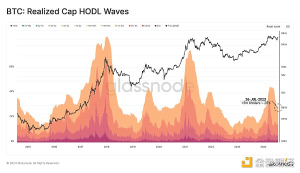 下圖顯示,長期持有者和短期持有者的大致時間界限是2024年2月下旬,他們是在此前后獲得的Tokens,當時的價格約為5.1萬美元。很可能,在ETF炒作的高峰期獲得的Tokens有很多將很快開始轉移到長期持有狀態,而且這種分化可能會加速。