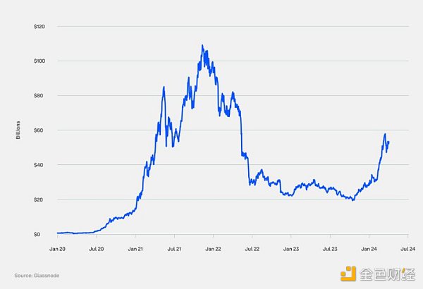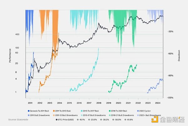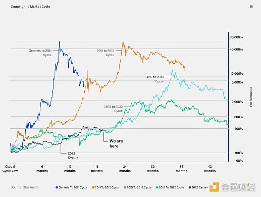 BTC已經經歷了4輪市場周期,各周期都有自己的牛市和熊市階段。本輪周期始于2022年,BTC價格較2022年11月的低點上漲了400%。本周期與2018-2022年周期類似,當時BTC價格較低點上漲了2000%。