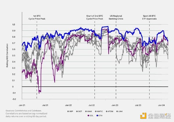 加密資產相關性在第二季度下降:ETH的相關性為0.7,一些山寨幣甚至低于0.5。這種相關性的脫鉤標志著市場對Tokens基本面有了更深入的理解。隨著監管的明確性和機構的采用,預計相關性會進一步下降。