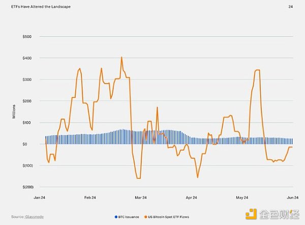 現貨ETF推動了對BTC的大量新需求,而新的BTC供應仍然局限于礦工獎勵。自現貨ETF開始交易以來,ETF的需求大大超過了BTC的發行量。