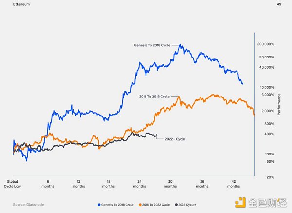 ETH已歷經兩個完整的市場周期。本輪周期始于2022年,自2022年11月以來,ETH上漲了240%以上。本輪周期與2018-2022周期相似,ETH價格較低點上漲了6000%。