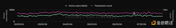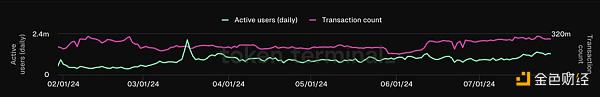 例如,7 月 26 日星期五,ETH 的交易筆數(shù)為 110 萬,而 DAU 為 376.3 萬,平均每位用戶每天的交易量約為 2.92 筆。然而,SOL 的交易筆數(shù)為 2.822 億,而 DAU 為 130 萬,平均每位用戶每天的交易量高達 217 筆。
