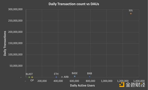 從表面上看,Solona的數(shù)字看起來不錯,每日活躍用戶 (DAU) 超過 130 萬,而 ETH 則為 376,300。然而,當我們將交易筆數(shù)添加到組合中時,我注意到有些奇怪。