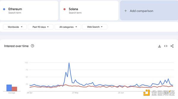 由于Solana用戶數(shù)量高于 ETH,我根據(jù) Google Trends 進行了檢查, Google Trends對于每個用戶的價值應(yīng)該是無感知的。