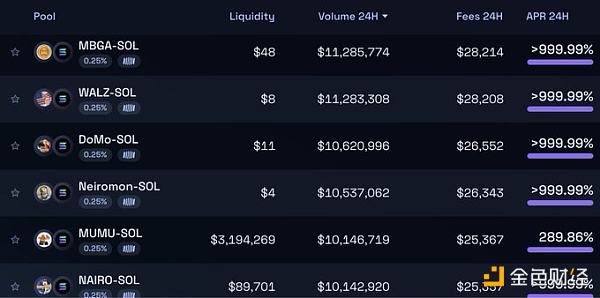 在過去 24 小時內(nèi),Raydium 標準 LP 上有超過 50 個交易量超過 250 萬美元的跑路項目,總共產(chǎn)生了超過 2 億美元的交易量和超過 50 萬美元的費用。Orca 和 Meteora 的跑路似乎要少得多,而我在 Uniswap (ETH) 上很難找到任何具有任何有意義交易量的跑路項目。