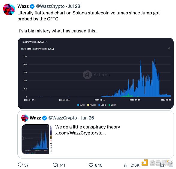 穩(wěn)定幣交易量動態(tài)凸顯了這一點,@WazzCrypto注意到 CFTC 宣布調(diào)查 Jump 后穩(wěn)定幣交易量突然下降: