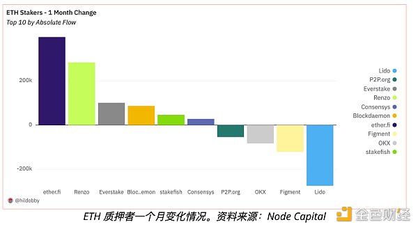 Ether.fi 在 4 月份出現大量資金外流。據 Node Capital 稱,4 月 2 日,該協議的絕對流量接近 400,000 個 ETH,而 Lido 的流出量超過 250,000 個 ETH。