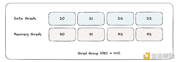 Leader Node通過稱為 Sharding 的過程將區(qū)塊拆分為 shred 的子區(qū)塊,其規(guī)格大小以 MTU(最大傳輸單元,無需將其分割成更小的單元即可從一個(gè)Node發(fā)送到下一個(gè)Node的最大數(shù)據(jù)量)為單位。然后通過使用 Reed-solomon 擦除碼方案來保障數(shù)據(jù)的完整性以及可用性。