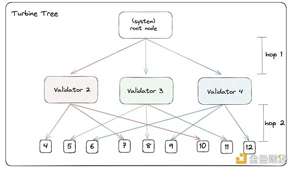 Turbine 將數(shù)據(jù)分片以后,使用多層傳播機(jī)制來進(jìn)行傳播,Leader Node會(huì)在每個(gè) Slot 結(jié)束之前將區(qū)塊交給任意一個(gè)區(qū)塊驗(yàn)證者,然后該驗(yàn)證者會(huì)將區(qū)塊分片成 Shreds,并且生成糾刪碼,該驗(yàn)證者之后會(huì)開啟 Turbine 傳播。首先要傳播到根Node,然后該根Node會(huì)確定哪些驗(yàn)證者位于第幾層。其過程如下所示:
