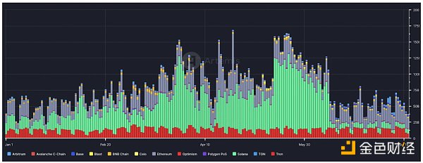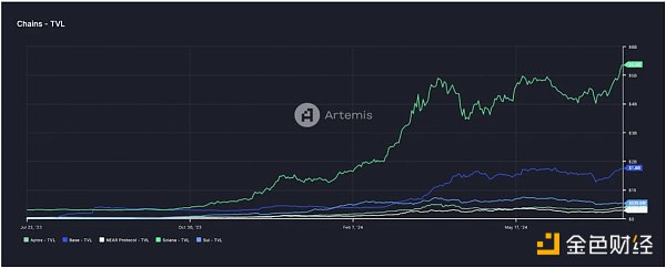 Solana 在 Defi 領(lǐng)域的 TVL 也進(jìn)展顯著,其 TVL 已經(jīng)創(chuàng)下歷史新高,并且與其它公鏈相比也有一大段距離,但是值得注意的是 Base 也處于高速成長(zhǎng)的階段。