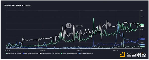 在一眾公鏈中,Base 被視為 EVM 生態(tài)潛在的 Solana 競(jìng)爭(zhēng)對(duì)手。Base 的鏈上活躍地址數(shù)正在迅猛增加,而 Solana 在具備先發(fā)優(yōu)勢(shì)的情況下,也仍處于高速增長(zhǎng)的階段。NEAR 維持高位不變,但是 Aptos 以及 Sui 在公鏈的競(jìng)爭(zhēng)中落后。