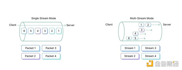 TCP 可靠性高于 UDP,但是 UDP 的速率高于 TCP,因?yàn)?TCP 會(huì)在包丟失的時(shí)候具備擁塞控制機(jī)制,重新傳輸丟失的包。UDP 速率高,可靠性低,Goggle 希望構(gòu)建一個(gè)可靠性高且速率高的傳輸層協(xié)議 QUIC。QUIC 最核心的特性就是相互獨(dú)立的邏輯流。它允許在單個(gè)連接上并行傳輸多個(gè)數(shù)據(jù)流,并且每個(gè)流可以獨(dú)立地處理。相比之下,TCP 只支持單數(shù)據(jù)流,需要按照發(fā)送順序接收和確認(rèn)每個(gè)報(bào)文。