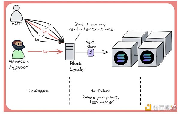 Solana 宕機(jī)的主要原因就是使用了該 QUIC 實(shí)驗(yàn)性應(yīng)用層協(xié)議,由于 UDP 以及多路傳輸?shù)目旖荩⑶蚁M3滞暾麛?shù)據(jù)的傳輸,因此其也會(huì)設(shè)計(jì)機(jī)制來對(duì)丟包情況進(jìn)行多次重傳。Leader Node在接收多個(gè)交易時(shí),是通過 QUIC 協(xié)議開啟多個(gè)通路進(jìn)行的,但是 Leader Node畢竟是一臺(tái)計(jì)算機(jī),尤其能夠處理的交易容量上線,因此在發(fā)生大量的交易涌入時(shí),Leader Node就會(huì)切段某些通路連接,這就會(huì)導(dǎo)致交易被 drop。如何選擇將被切斷的連接并沒有一套既定的標(biāo)準(zhǔn)(比如切斷所有費(fèi)用低于 xxx 的連接),所有連接是否會(huì)被切斷都是隨機(jī)性的。因此這就導(dǎo)致了存在一定黑箱操作的空間,Leader Node可能更傾向于有利可圖的 MEV 交易,而放棄用戶的低價(jià)值交易。MEV
