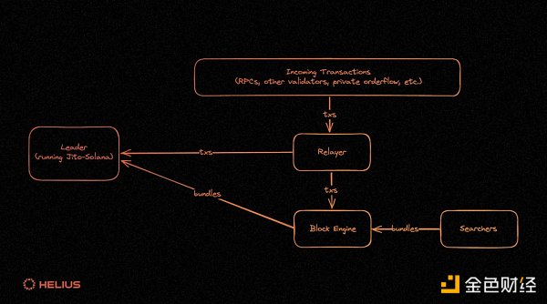 Jito Labs 客戶端目前占據(jù)了 50% 的客戶端市場(chǎng)份額,因此 Jito Labs 自己構(gòu)建了一個(gè)偽 mempool,用戶通過 RPC 進(jìn)入一個(gè)偽 mempool 停留大約 200 ms。jito labs 提供了一個(gè)鏈下的包含保障,能夠保證該 bundle 內(nèi)的所有交易均包含進(jìn)區(qū)塊中。搜索者可以競(jìng)標(biāo)夾層攻擊待處理交易的機(jī)會(huì),Searchers 通過競(jìng)標(biāo)到利潤(rùn)最大化的 Bundle,然后 Block Engine 負(fù)責(zé)尋找出競(jìng)價(jià)最高的 Bundle 提交給運(yùn)行 Jito Labs 客戶端的 Leader。